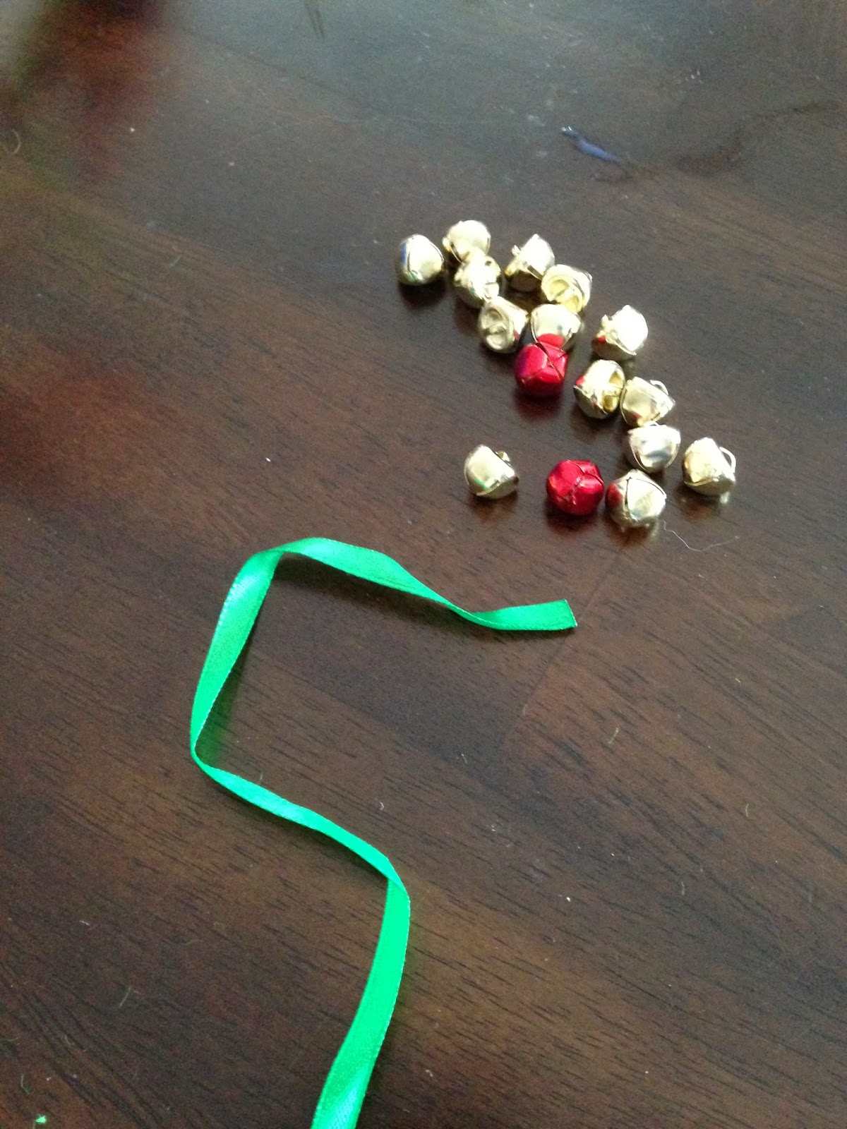 Lay out all of your materials. Give your toddler the pipe cleaner and have them string the bells or beads on the cleaner.